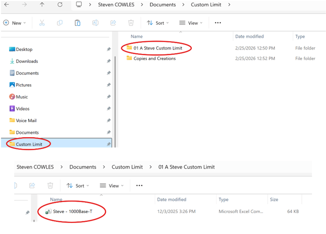 - Save the .csv limit file into a folder on your computer which is titled as you want to have it appear in the Vendor limits folder on the TestPro. In the example shown, there is a main folder titled “Custom Limit”, there is a sub-folder titled “01 A Steve Custom Limit”. Opening this sub-folder shows the custom limit file titled “Steve – 1000Base-T”. Once you have this file in the folder as shown, it can be imported to the TestPro using TestDataPro PC Software. In the example, only one limit is in folder, but you could have more than one if you need to import multiple custom limits in the same folder.
