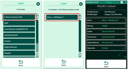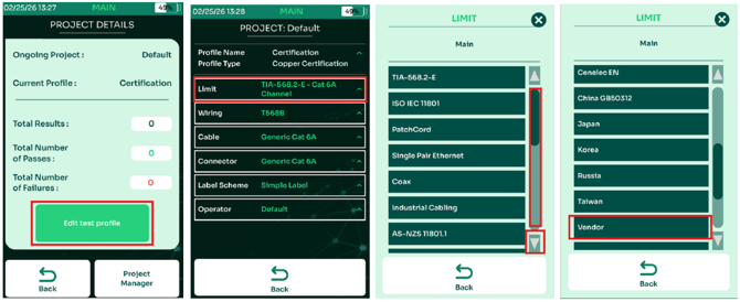 - In the “Vendor” folder, select your newly imported folder, note in my example the folder is at the top of the list of folders, but it is based on the alphanumeric sorting, you may need to scroll down to find your folder. Next, select the limit you want to use, in this example there is only one. After selecting the limit, you will be automatically returned to the Project screen which displays all of your settings. If needed, change your Wiring, Cable, Connector, Label Scheme or Operator information. The TestPro is now ready to test using the custom limit.