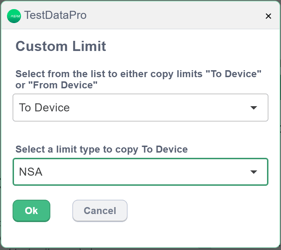 - From the popup dialog box for Custom Limit, there are two dropdown options. “To Device” is correct. In the example, we are importing a copper limit, so we will leave this at the default “Copper”. Click the green Ok button.
