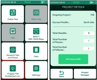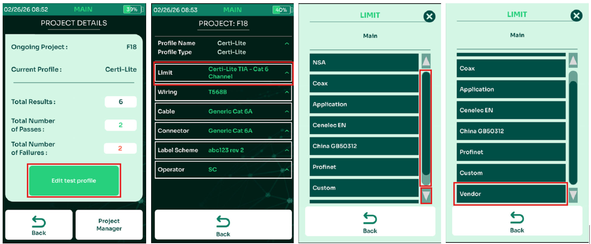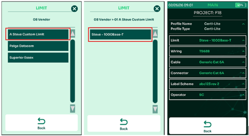 - In the “Vendor” folder, select your newly imported folder, note in my example the folder is at the top of the list of folders, but it is based on the alphanumeric sorting, you may need to scroll down to find your folder. Next, select the limit you want to use, in this example there is only one. After selecting the limit, you will be automatically returned to the Project screen which displays all of your settings. If needed, change your Wiring, Cable, Connector, Label Scheme or Operator information. The NSA is now ready to test using the custom limit.